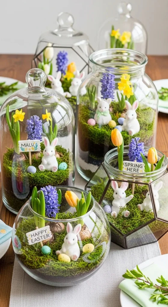 Create individual Easter terrariums for each guest as part of your table décor. Use small glass containers, add moss, miniature bunnies, tiny eggs, and spring flowers inside. Not only do these terrariums make your table look magical, but they also double as personalized favors that your guests can take home, making your celebration unforgettable.