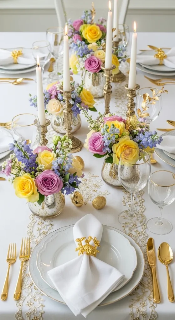 Combine pastel Easter colors with gold accents for a touch of glamour. Use gold flatware, napkin rings, and candleholders paired with soft pinks, blues, and yellows. Add delicate flowers or small vases filled with pastel blooms to complete the look. This setup strikes the perfect balance between festive charm and elegant sophistication.