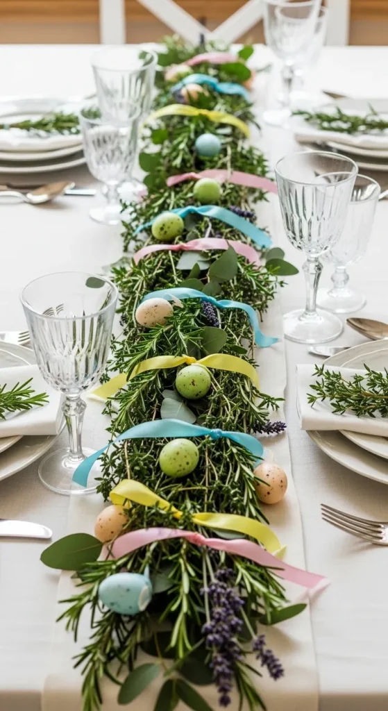 Bring nature directly onto your table with a fresh herb table runner. Use sprigs of rosemary, thyme, lavender, and eucalyptus to create a fragrant and visually appealing runner down the length of your table. Intertwine small Easter eggs or pastel ribbons for a festive touch. This idea not only looks stunning but also gives your table a subtle, refreshing aroma.
