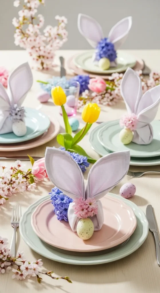 Elevate your table setting with creative napkin folds shaped like bunny ears. Use pastel-colored napkins and fold them carefully to stand upright on each plate. Pair with matching dinnerware and subtle floral accents. This small but impactful detail adds playfulness and sophistication, making each guest feel special.