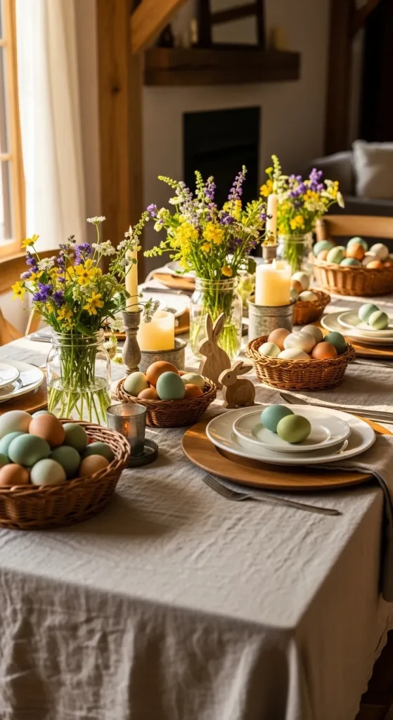 For a charming, countryside feel, decorate your Easter table with rustic elements. Think linen tablecloths, wooden chargers, wicker baskets filled with eggs, and mason jars with wildflowers. This décor is simple yet elegant, giving your table a warm, inviting, and authentic farmhouse atmosphere that is perfect for a relaxed Easter lunch.