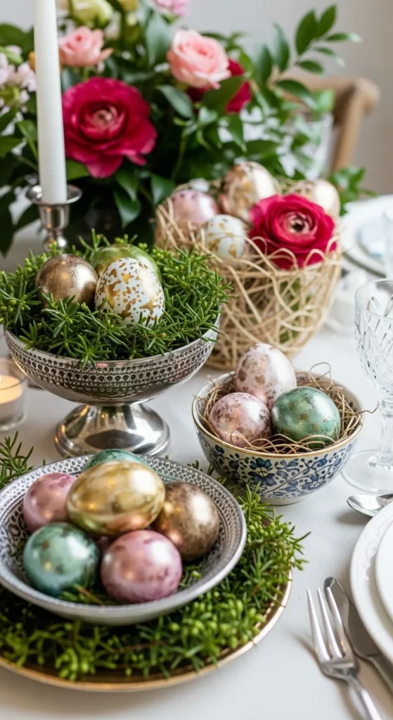 Make Easter eggs the star of your table with a painted egg display. Use ceramic, wooden, or real eggs painted in metallics, pastels, or intricate patterns. Arrange them in a decorative bowl, basket, or tiered tray in the center of the table. Adding a few sprigs of greenery or small flowers around the eggs enhances their visual appeal and makes the display look luxurious.