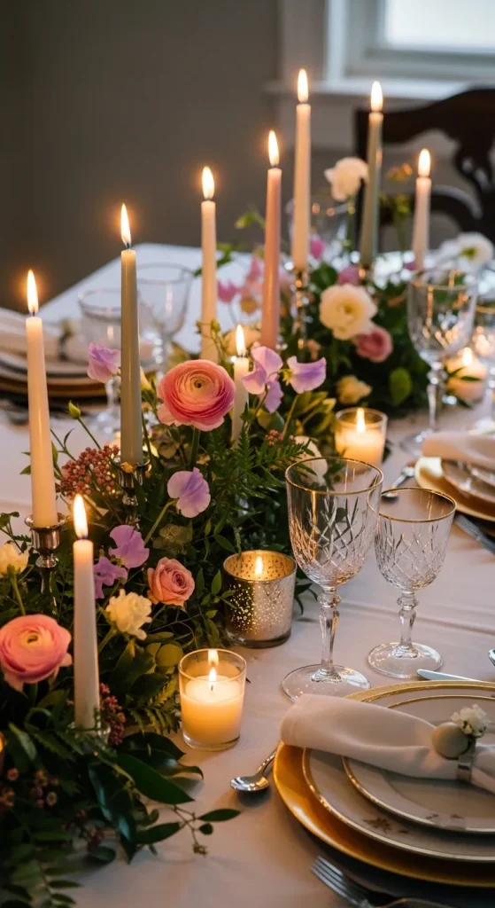For a sophisticated Easter table, incorporate candles into your décor. Use a combination of tall taper candles and small votives in pastel shades. Arrange them along a table runner in the center of the table and mix in spring flowers or greenery. The warm candlelight reflects off glassware, creating a cozy and elegant ambiance perfect for Easter brunch or dinner.