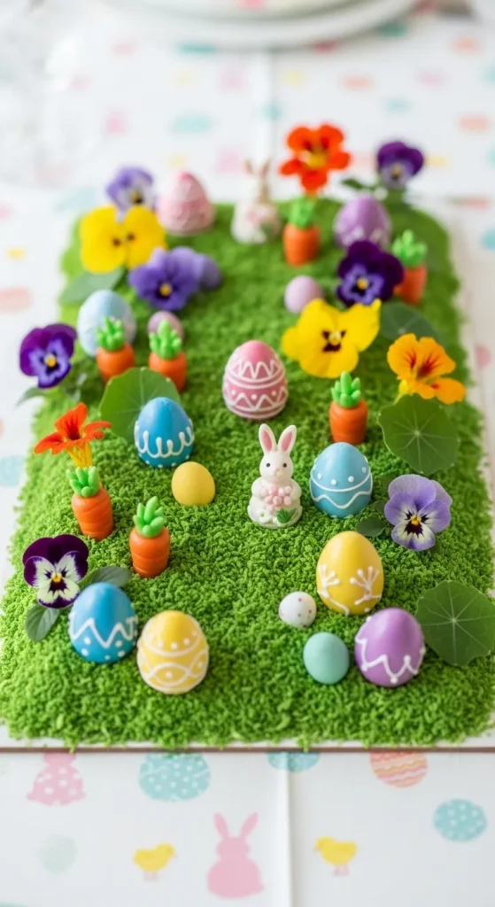 Transform your table into a mini Easter garden that is both decorative and edible. Use a long tray filled with green coconut grass, edible flowers, and chocolate eggs. Add tiny edible carrots made from marzipan or fondant. This not only serves as a centerpiece but also doubles as a sweet treat for guests to enjoy.