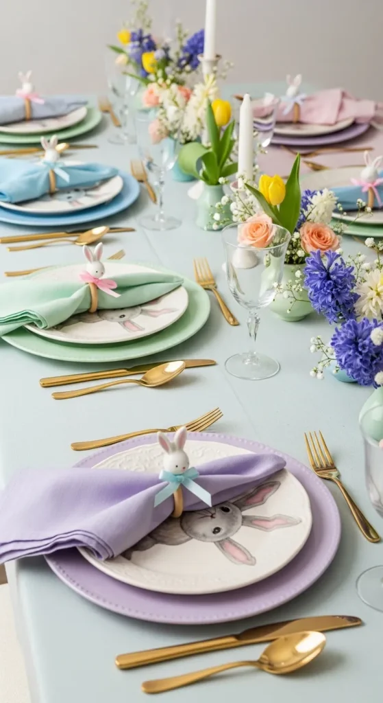 Bring some playful charm to your Easter table with bunny-themed place settings. Use mini bunny figurines or napkin rings shaped like bunnies at each seat. Pair them with pastel-colored plates and gold cutlery to add elegance. You can even attach name tags to the bunnies for a personalized touch. This idea is especially delightful for family gatherings with children.