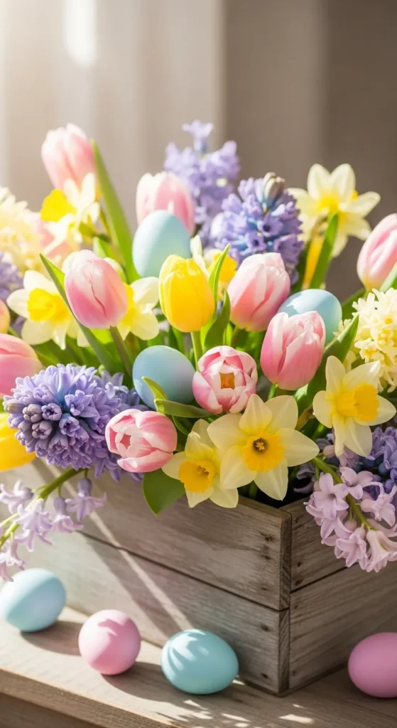 Nothing says Easter like soft pastel flowers. Create a centerpiece using a mix of tulips, daffodils, and hyacinths in shades of pink, yellow, lavender, and white. Place them in a rustic wooden box or a glass vase, and scatter small Easter eggs around for a whimsical touch. This setup not only adds color but also a fresh spring scent to your table.