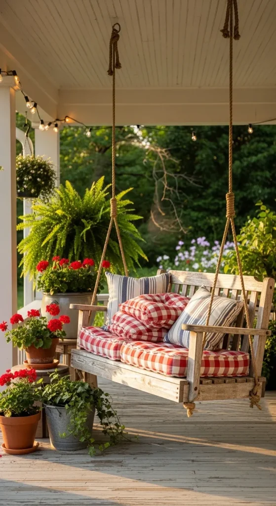 Nothing says farmhouse comfort like a porch swing. Opt for a wooden swing with a weathered finish and add layers of cushions in muted tones or gingham patterns. A swing not only provides functional seating but also adds a focal point to your porch, inviting relaxation and conversation.