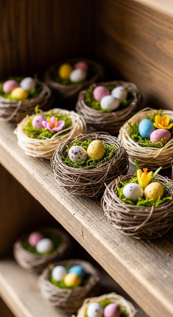 Mini Easter nests are perfect for tabletops, shelves, or as party favors. Use twigs, raffia, or shredded paper to craft tiny nests, and fill them with chocolate eggs or small trinkets. These delicate nests add a natural, whimsical element to your decor and are quick to assemble.