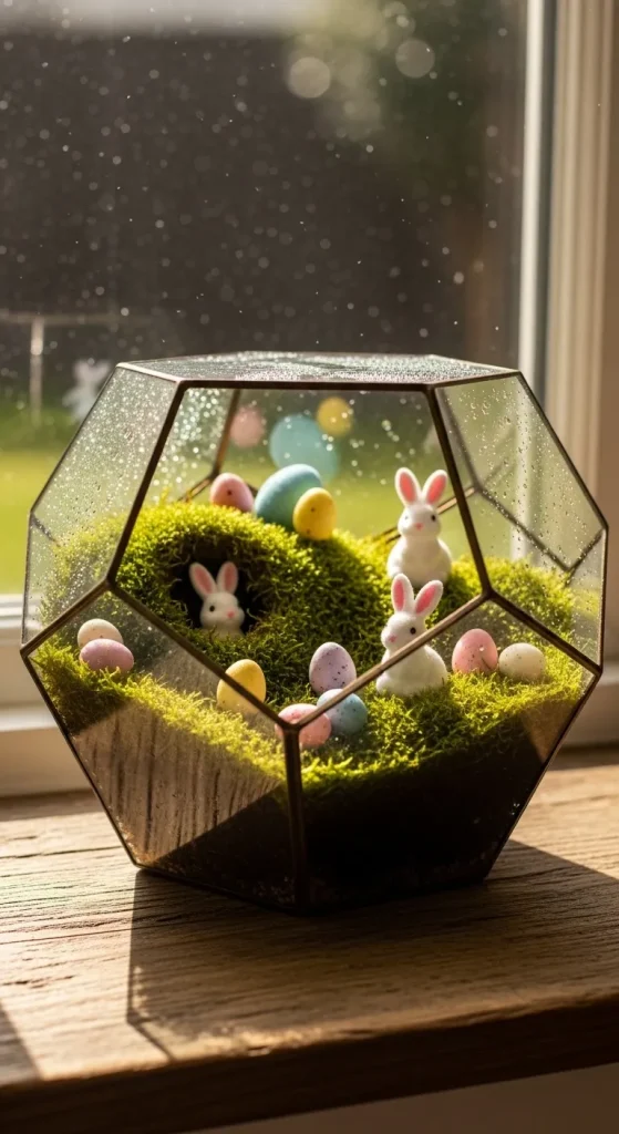 Terrariums aren’t just for plants—they can also be seasonal decor! Fill glass containers with moss, small Easter eggs, miniature bunnies, or pastel-colored candies. They make a beautiful centerpiece or a charming addition to your shelves, offering a mix of elegance and whimsy.