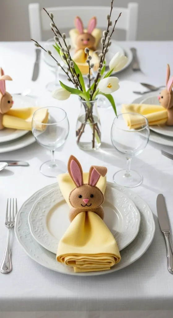 Elevate your Easter table with DIY bunny napkin rings. Cut bunny shapes from felt or cardboard, and secure them around your folded napkins with ribbon. These little accents add a playful, festive touch to your table setting and are sure to impress your guests.