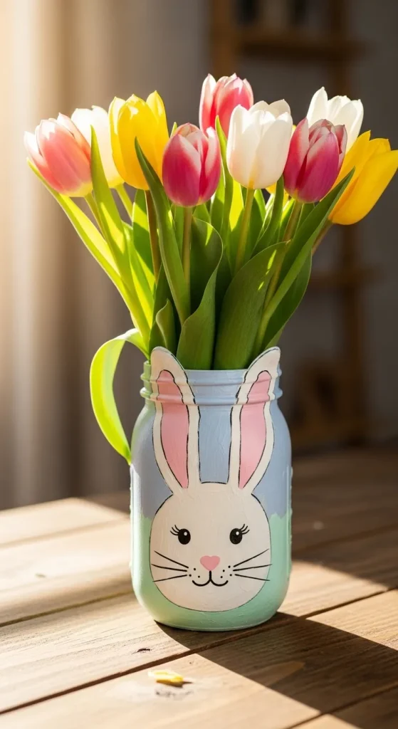 Transform simple mason jars into adorable Easter bunnies. Paint the jars in pastel shades and use felt or paper to create ears and cute little faces. Fill the jars with fresh spring flowers like tulips or daffodils for a whimsical centerpiece. This DIY is not only quick but also reusable year after year.