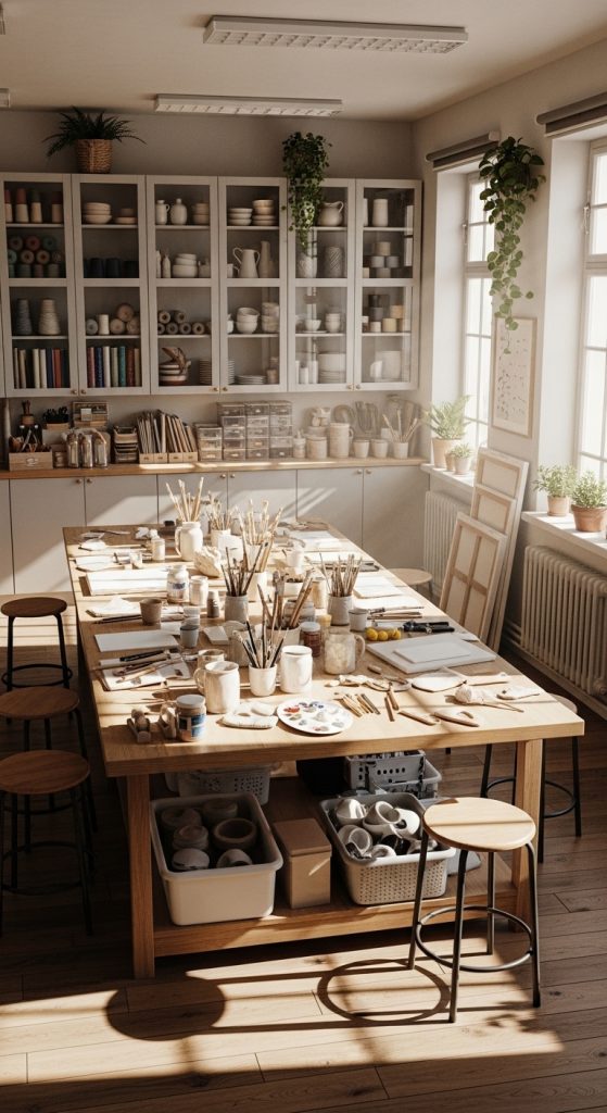 An open studio layout is ideal for crafters who need room to spread out projects. Use a central island or large table as the focal point, surrounded by storage cabinets along the walls. This setup works great for sewing, painting, or large craft projects that need uninterrupted space. Large windows or skylights enhance natural light, making colors pop and energy flow.