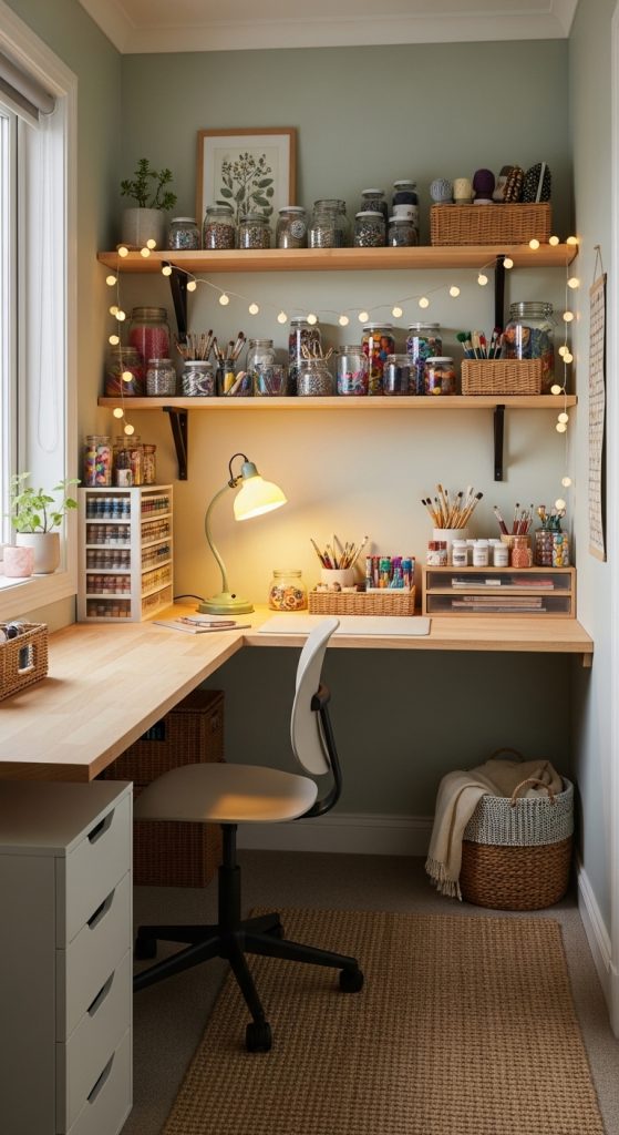 If space is limited, a corner nook can become a cozy crafting hub. L-shaped desks tucked into a corner maximize workspace while keeping the room open. Floating shelves above the desk allow for vertical storage, and under-desk organizers keep supplies at your fingertips. Add a comfortable chair and good lighting for long creative hours.
