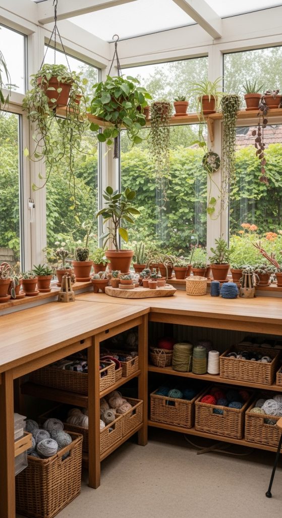 Bring the outdoors in with a nature-inspired craft room. Natural wood tables, wicker baskets, and plenty of plants create a soothing environment. Large windows or skylights let in natural light, while neutral and green hues mimic the outdoors. This layout encourages relaxation and creativity simultaneously.