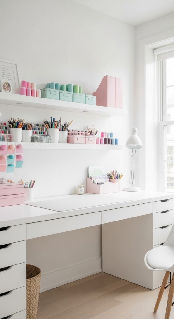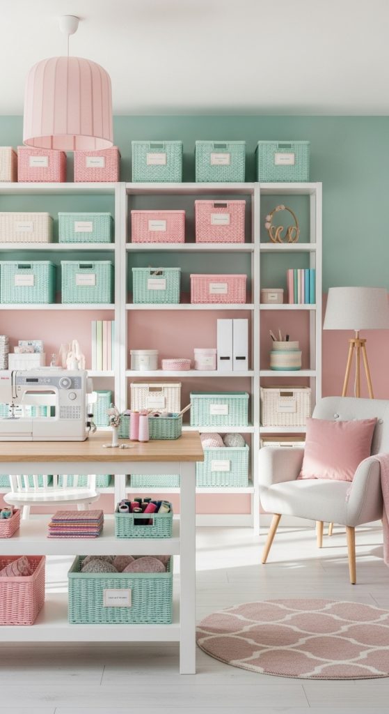 Create a dreamy, pastel-inspired craft room that feels like an artful escape. Soft colors like mint green, blush pink, or sky blue paired with white furniture create a light and airy atmosphere. Include open shelves for display, elegant baskets for storage, and a stylish rug for added warmth. This type of layout is perfect for crafters who love aesthetics as much as functionality.