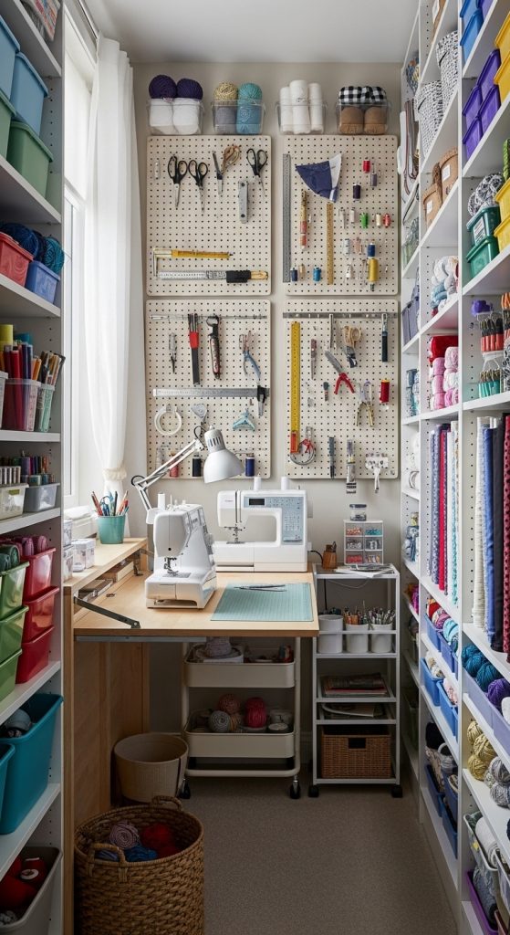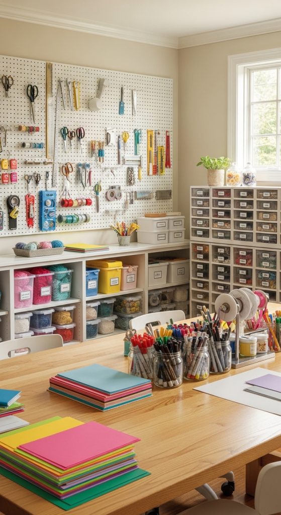 For crafters with lots of supplies, wall-to-wall storage is a game-changer. Tall cabinets, pegboards, and open shelving along every wall make sure everything has a place. Transparent bins or labeled containers make it easy to see and access your tools. Pair with a large, simple table in the center for creating and assembling projects.