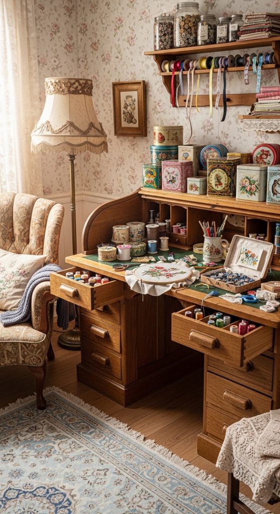 Add charm with a vintage-inspired craft room layout. Antique desks, floral wallpaper, and decorative storage tins give the space personality. Mix open shelving with closed cabinets to balance aesthetics and function. A vintage armchair or pouf adds comfort, while soft lighting completes the cozy feel.