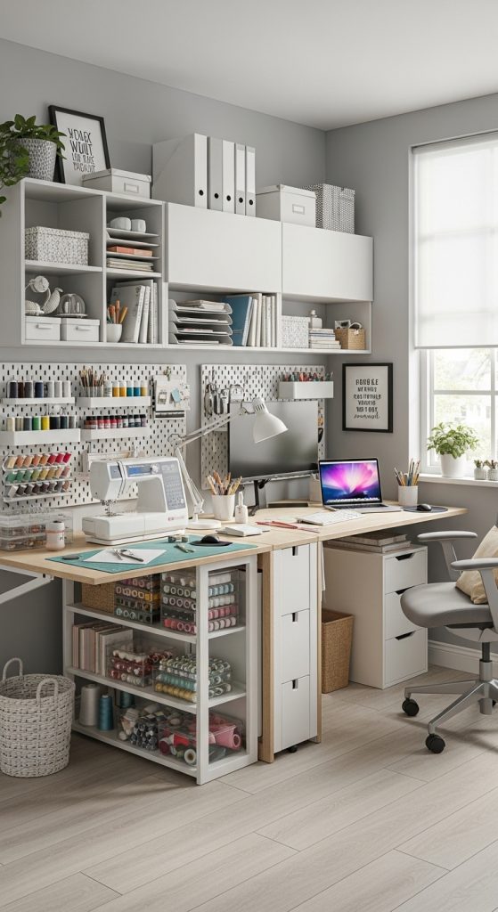 Combine crafting with other hobbies or functions for a versatile space. Include a foldable table or convertible desk, storage for multiple hobbies, and modular shelving units. This layout is perfect for families where the craft room doubles as a homework station, a gift-wrapping zone, or even a mini home office.