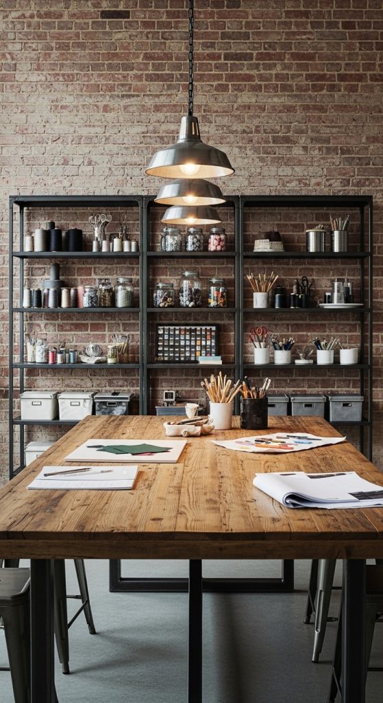 Industrial design gives your craft room a modern, edgy look. Think exposed brick, metal shelving, and reclaimed wood tables. Use task lighting like pendant lamps and adjustable desk lights to illuminate work areas. Rolling carts and modular metal storage units make this layout both stylish and practical.