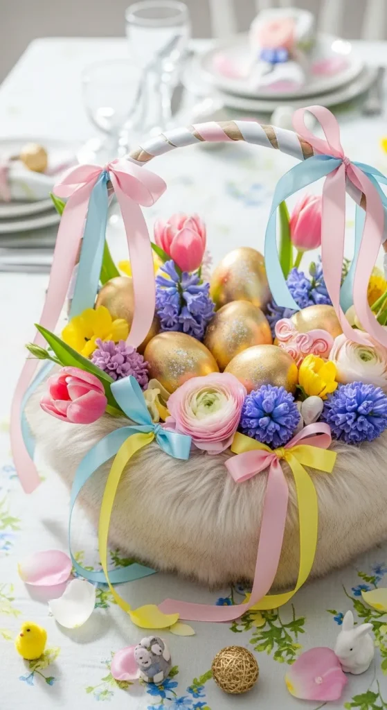 Take a basic Dollar Tree basket and turn it into a luxurious Easter treasure. Line it with faux fur or soft pastel fabric. Add a combination of gold-dipped eggs, faux florals, and delicate ribbons. This basket not only holds treats but also doubles as a stunning décor piece.