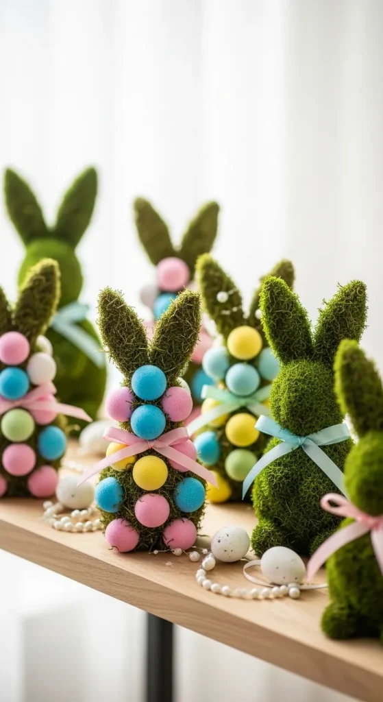 Create mini topiaries with Dollar Tree foam balls, faux moss, and miniature bunny figurines. Paint the foam balls in pastel shades and attach them to small wooden dowels or pots. Add decorative ribbons or pearls to elevate the look. These bunny topiaries are perfect for table décor or as charming shelf accents.