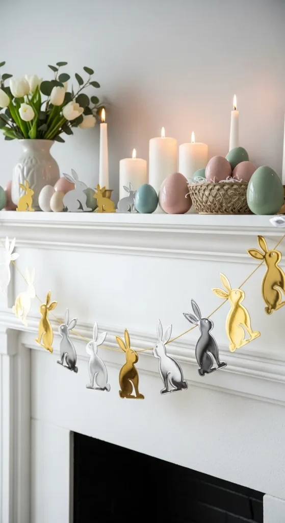 Make a sophisticated Easter garland using Dollar Tree paper or foam bunnies. Paint them in metallic tones like gold, rose gold, or silver. String them together with twine or ribbon, and drape across a mantel, window, or wall. This simple craft adds a polished and festive touch to your holiday décor.