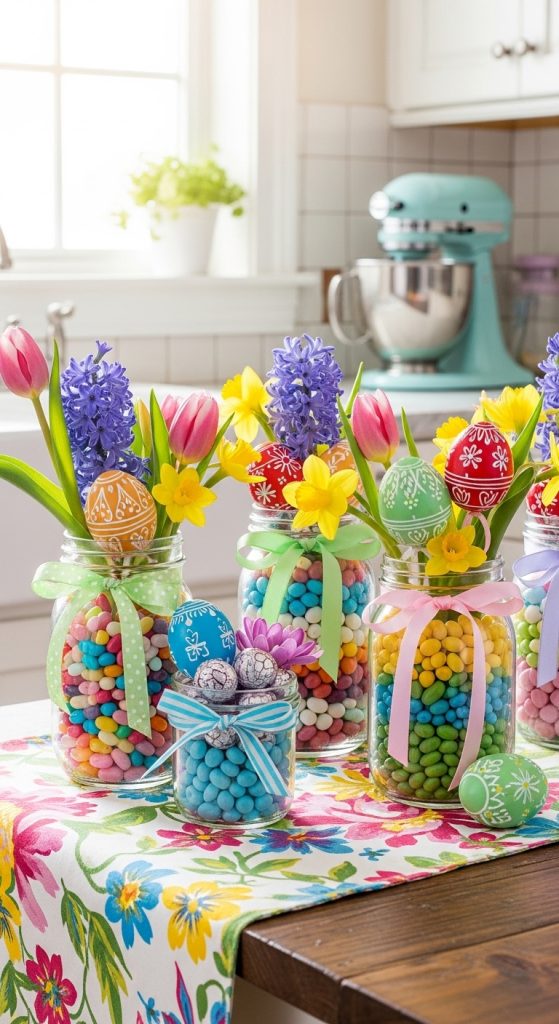 Decorate your kitchen, living room, or mantel with Easter-themed mason jars. Fill them with pastel candies, fresh flowers, or colorful eggs. You can also paint or tie ribbons around the jars to match your color palette. These versatile decorations are charming, budget-friendly, and great for adding small pops of Easter cheer throughout your home.