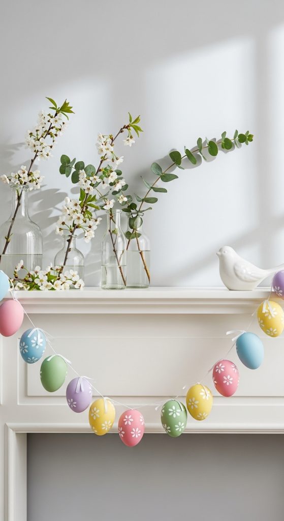 Bring playful elegance to your walls or mantels with a pastel egg garland. Use painted eggs in soft pinks, yellows, blues, and greens threaded on a natural twine or delicate ribbon. Hang above windows, doors, or along the staircase for a whimsical touch. The subtle pastel tones add cheer without overpowering your interior décor.