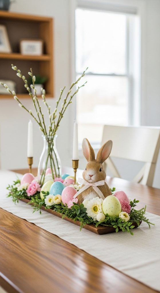 Create a stunning focal point for your dining table using bunny figurines, pastel-colored eggs, and fresh spring flowers. Mix ceramic, wooden, or metallic bunnies with moss and candles for a charming arrangement. This centerpiece draws attention without overwhelming your table setting, making it perfect for Easter brunch or dinner.