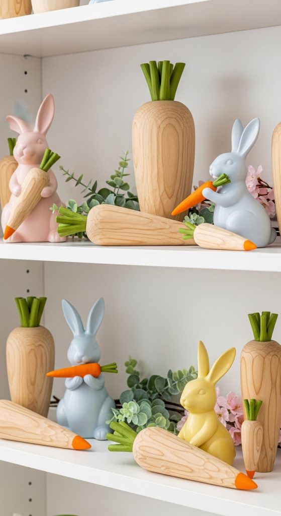 Add charm to your shelves by combining bunny figurines with decorative carrots and spring greenery. Mix heights and textures—ceramic bunnies with wooden carrots or velvet fabric accents—to create depth and visual interest. This idea is perfect for living rooms, kitchens, or even office spaces that need a seasonal touch.