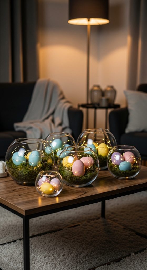 Transform your coffee table or sideboard into a pastel wonderland. Arrange decorative Easter eggs in glass bowls, wooden crates, or vintage trays. Enhance the display with moss, fairy lights, or small spring flowers. This setup offers a modern yet playful approach to Easter decoration that complements any interior style.