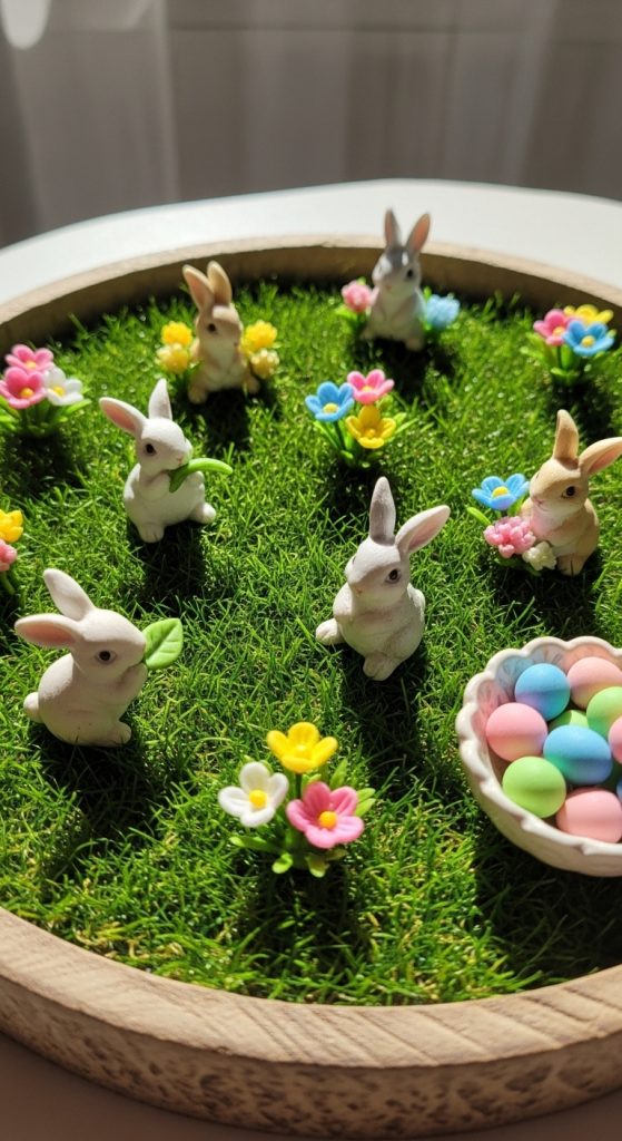 Bring spring inside with a small indoor bunny garden. Use faux grass, miniature ceramic bunnies, tiny flowers, and pastel eggs in a decorative planter or shallow tray. This playful miniature landscape is perfect for coffee tables, shelves, or window sills and adds a delightful, whimsical touch to any room.
