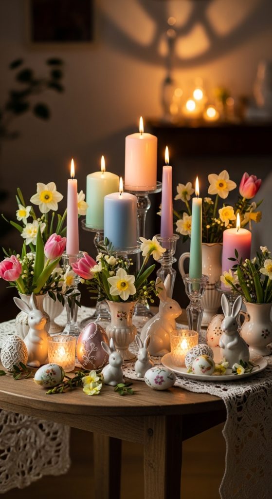 Create an intimate atmosphere with candlelit vignettes around your home. Use pastel candles, floral arrangements, and small decorative eggs or bunnies on trays or side tables. This décor idea brings warmth and a soft glow, perfect for evening gatherings or a quiet, festive ambiance.
