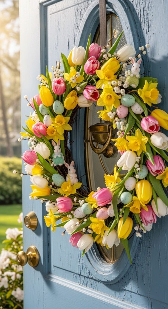 Welcome guests with a fresh floral wreath on your front door or as indoor wall décor. Combine spring blooms like tulips, daffodils, and lilies with miniature eggs and tiny bunny figurines. This décor piece merges the beauty of nature with festive Easter symbolism, creating an inviting entryway or cozy wall display.