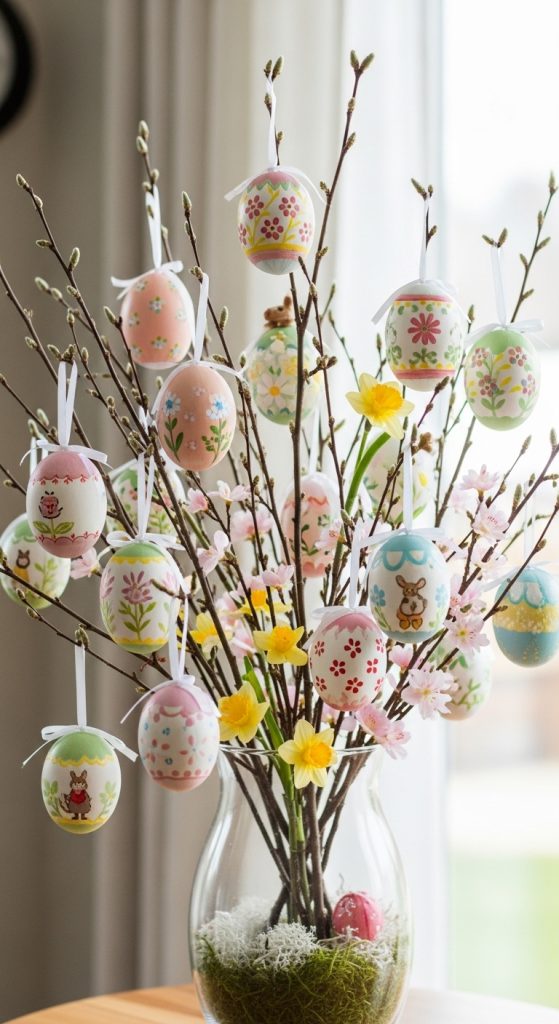Bring a touch of whimsy indoors with a DIY Easter egg tree. Use bare branches in a vase and hang colorful, hand-painted eggs with ribbons. You can also add miniature flowers, tiny bird nests, or glitter accents to create a magical, eye-catching piece. It’s a creative way to display Easter eggs while maintaining a modern aesthetic.