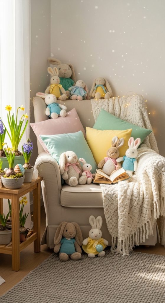 Design a cozy corner dedicated to Easter by placing a mix of bunny plushies, ceramic figures, and pastel cushions. Surround the area with fresh flowers, small potted plants, and fairy lights to make it a delightful reading or relaxation nook. Kids and adults alike will love the festive, playful vibe this space offers.