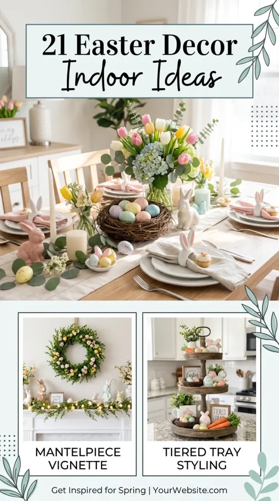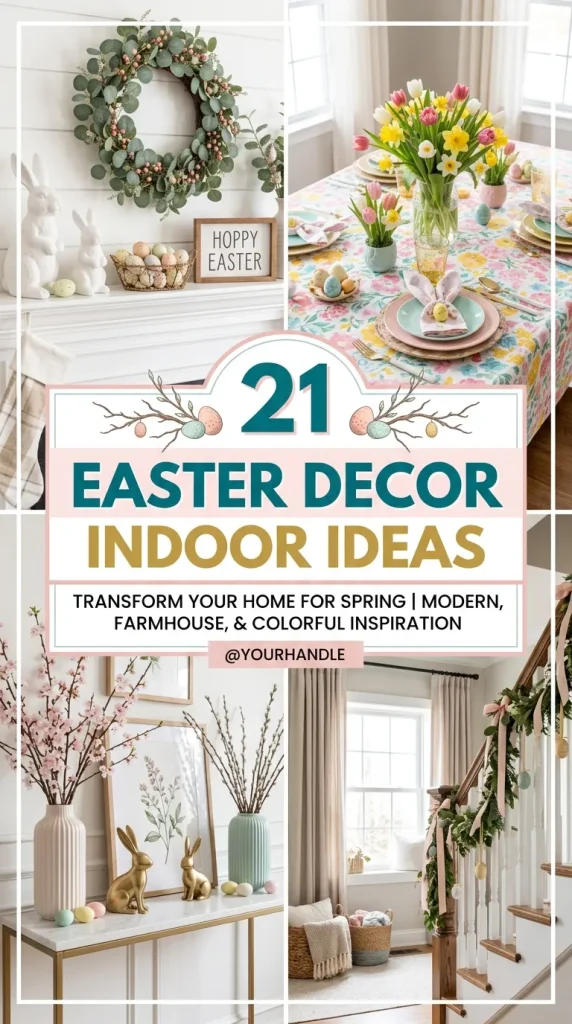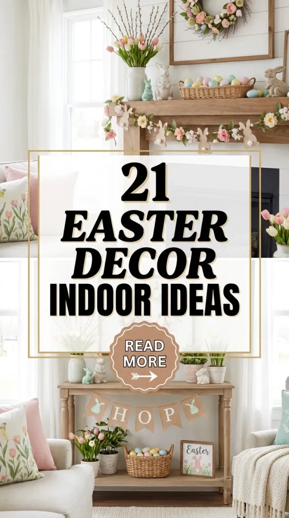 Indoor Easter décor allows for endless creativity. By combining bunnies, eggs, flowers, and pastel colors, you can create spaces that are both elegant and playful. Each of these ideas works well individually or can be mixed and matched for a festive Easter home makeover.