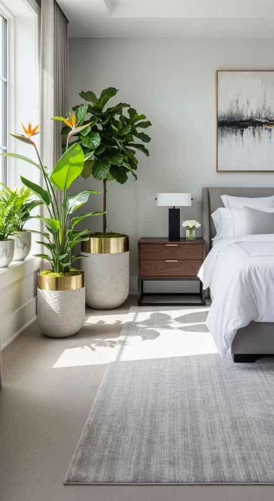 Bring life and serenity to your modern master bedroom with indoor plants. Tall potted plants, hanging greenery, or even a small indoor tree can add freshness and a pop of color. Select elegant planters and keep the greenery well-maintained to complement the luxurious aesthetic.