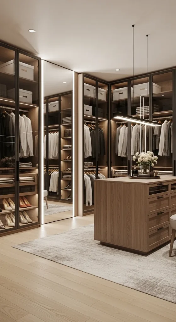 Key Elements: Glass wardrobes, built-in shelves, LED-lit mirrors, spacious walk-in layout.