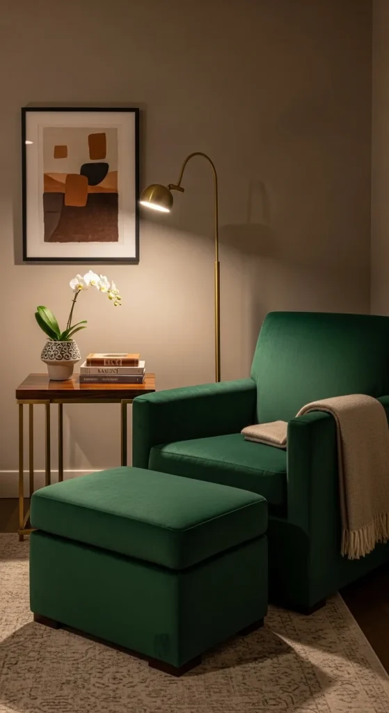 Key Elements: Comfortable armchair, designer rug, stylish side table, floor lamp.