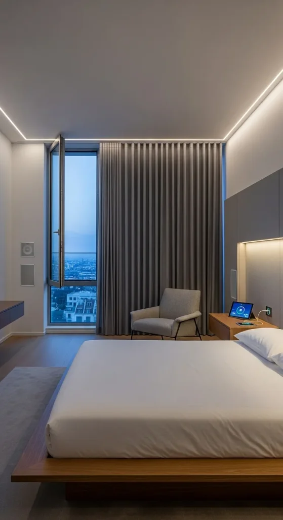 Key Elements: Smart lighting, hidden speakers, automated curtains, tech-integrated furniture.
