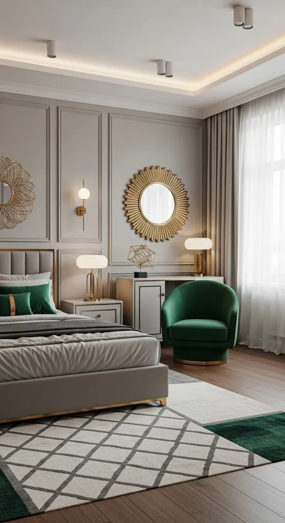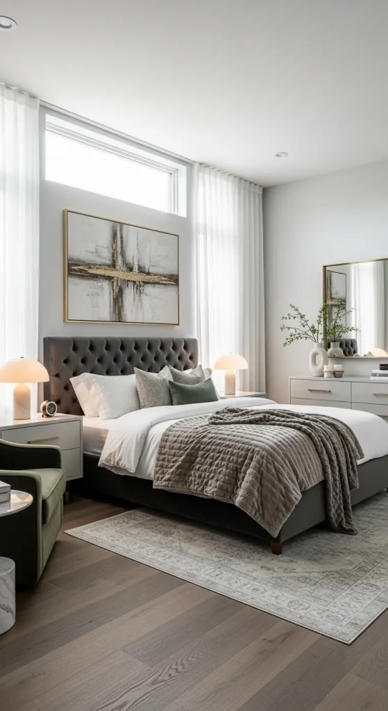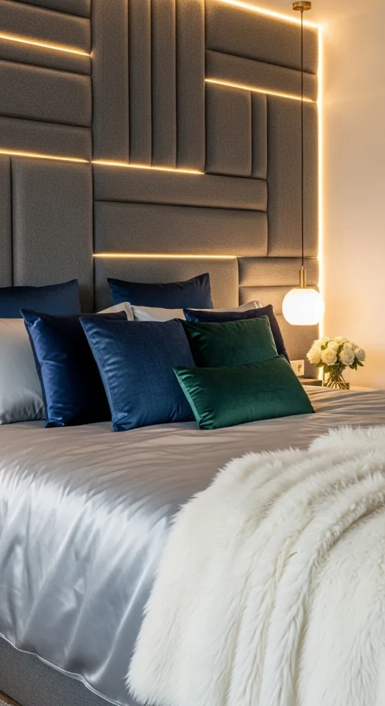 Mixing textures adds dimension and opulence. Combine velvet upholstered furniture with silk or linen bedding. Incorporate plush rugs, soft throw blankets, and textured cushions. The contrast between smooth surfaces and tactile fabrics makes the bedroom feel rich and inviting.