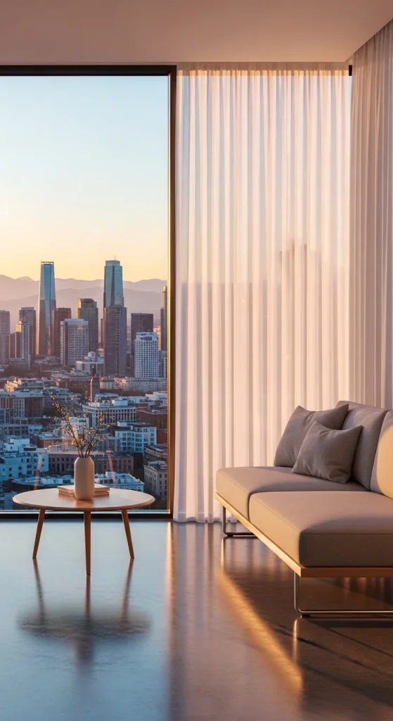 Key Elements: Expansive windows, flowing drapes, sheer curtains, scenic views.
