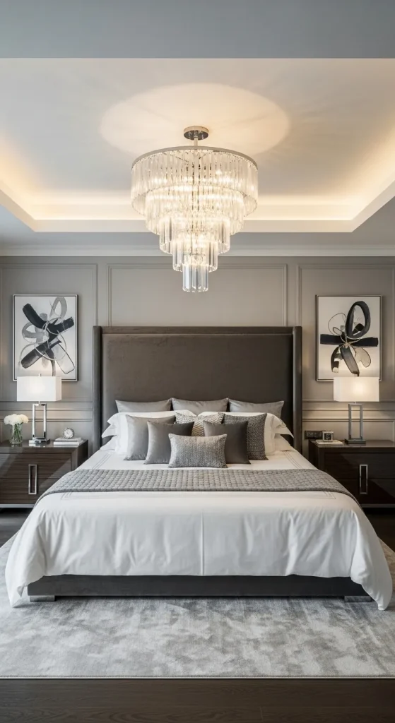 Key Elements: Artistic chandelier, adjustable LEDs, modern bedside lamps, soft mood lighting.