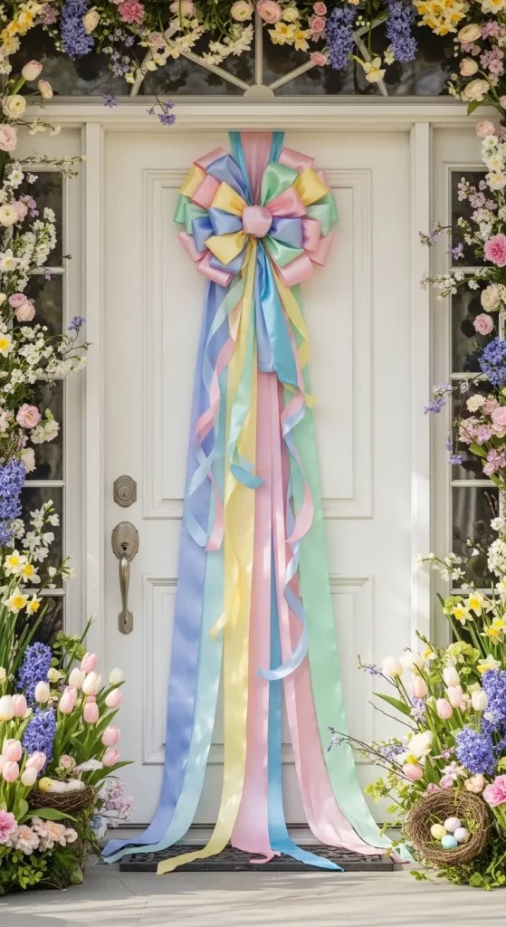 Give your door a quick Easter makeover with ribbon accents. Use wide satin or organza ribbons in pastel shades and create cascading designs, bows, or even a “ribbon curtain” effect. This approach adds a pop of color and movement to your porch and is incredibly fast to implement. Pair with a wreath or garland for a cohesive festive look.
