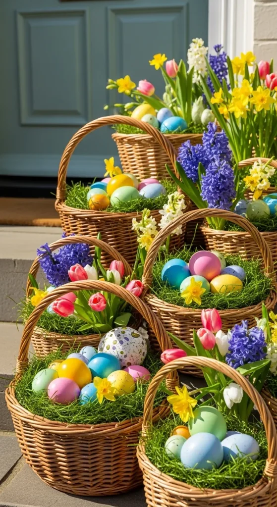 Nothing says Easter more than baskets overflowing with colorful eggs. Create a charming porch vignette using wicker baskets filled with faux grass, eggs, and small flowers. Place a few baskets of varying sizes near your steps or beside your door to add depth and texture. Add a ribbon or bow on the handle for an extra decorative touch.