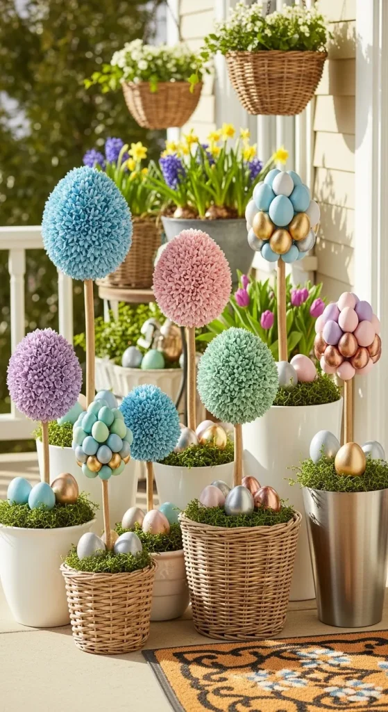 Egg topiaries are a striking way to combine elegance and festivity. Use small faux eggs glued onto foam balls or spheres and attach them to wooden dowels in pots. You can paint the eggs in metallic or pastel shades for a modern twist. Cluster a few topiaries of varying heights for a dynamic visual display.