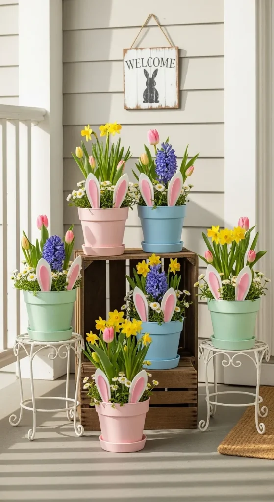 Turn ordinary planters into Easter-themed art with bunny ears. Use foam, cardboard, or wooden cutouts to create ears and attach them to the pots. Paint or decorate the pots in pastel colors, and fill them with fresh flowers or greenery. This playful twist is charming for children and adults alike, giving your porch a whimsical, joyful feel.