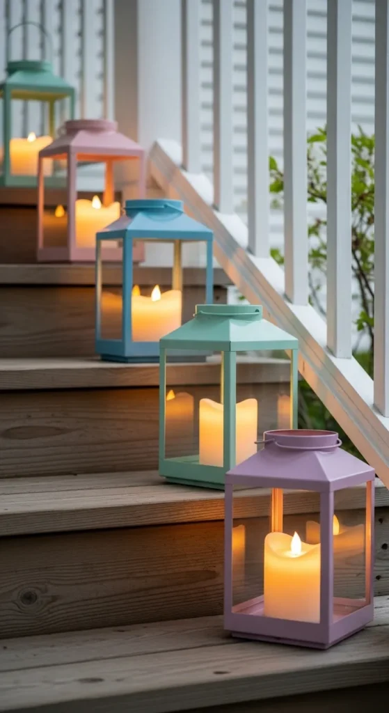 Add a touch of elegance and soft lighting to your porch with pastel lanterns. Paint or purchase lanterns in soft Easter hues and place candles or LED lights inside. Line them along your steps, porch edges, or hang them from hooks to create a warm, inviting ambiance.