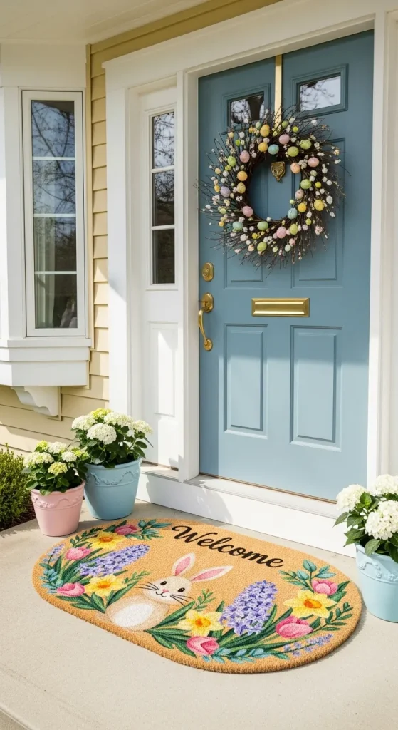 A themed welcome mat is an easy way to greet guests in style. Look for mats featuring Easter motifs such as bunnies, eggs, or floral designs. If you’re feeling crafty, you can paint your own using stencils and vibrant acrylic paint. Pair the mat with matching pots or a wreath to create a cohesive look.
